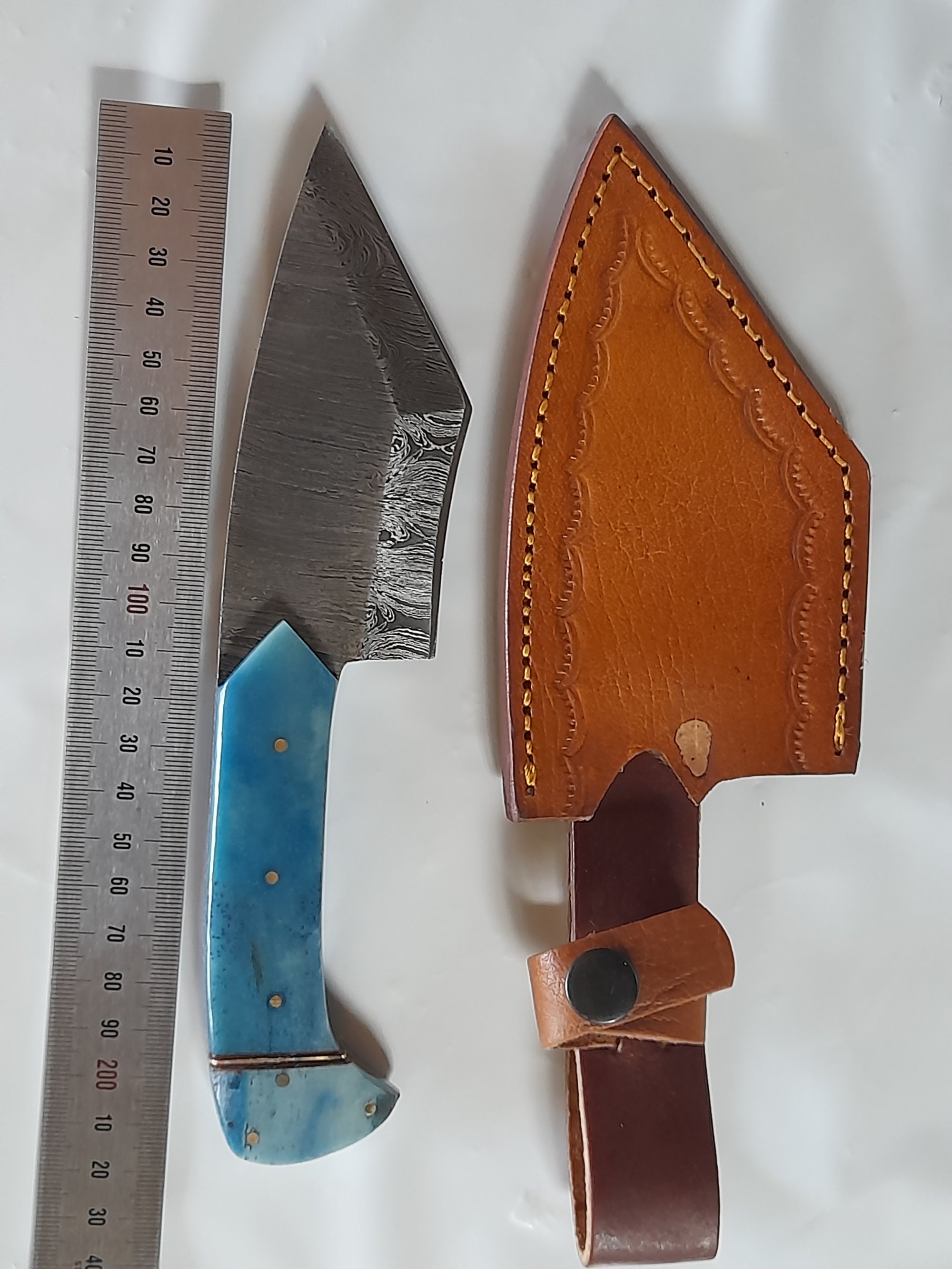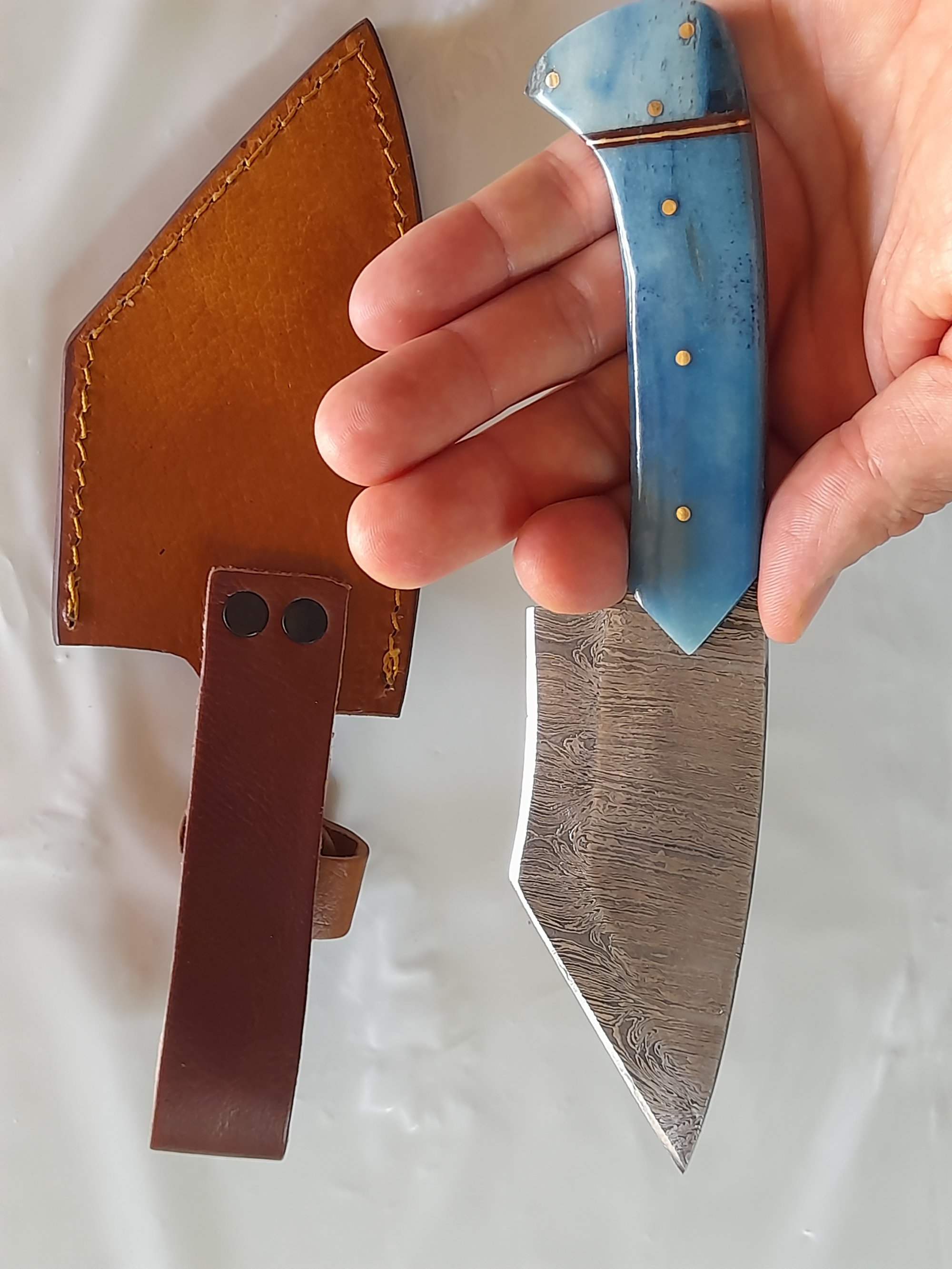 Hand Forged Damascus Fixed Knife Tanto Point Blue Bone Handle Leather Sheath