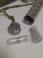 This survival knife model might exist in a few modifications with included and custom items. There is a space for additional items in the handle and the items tray.
