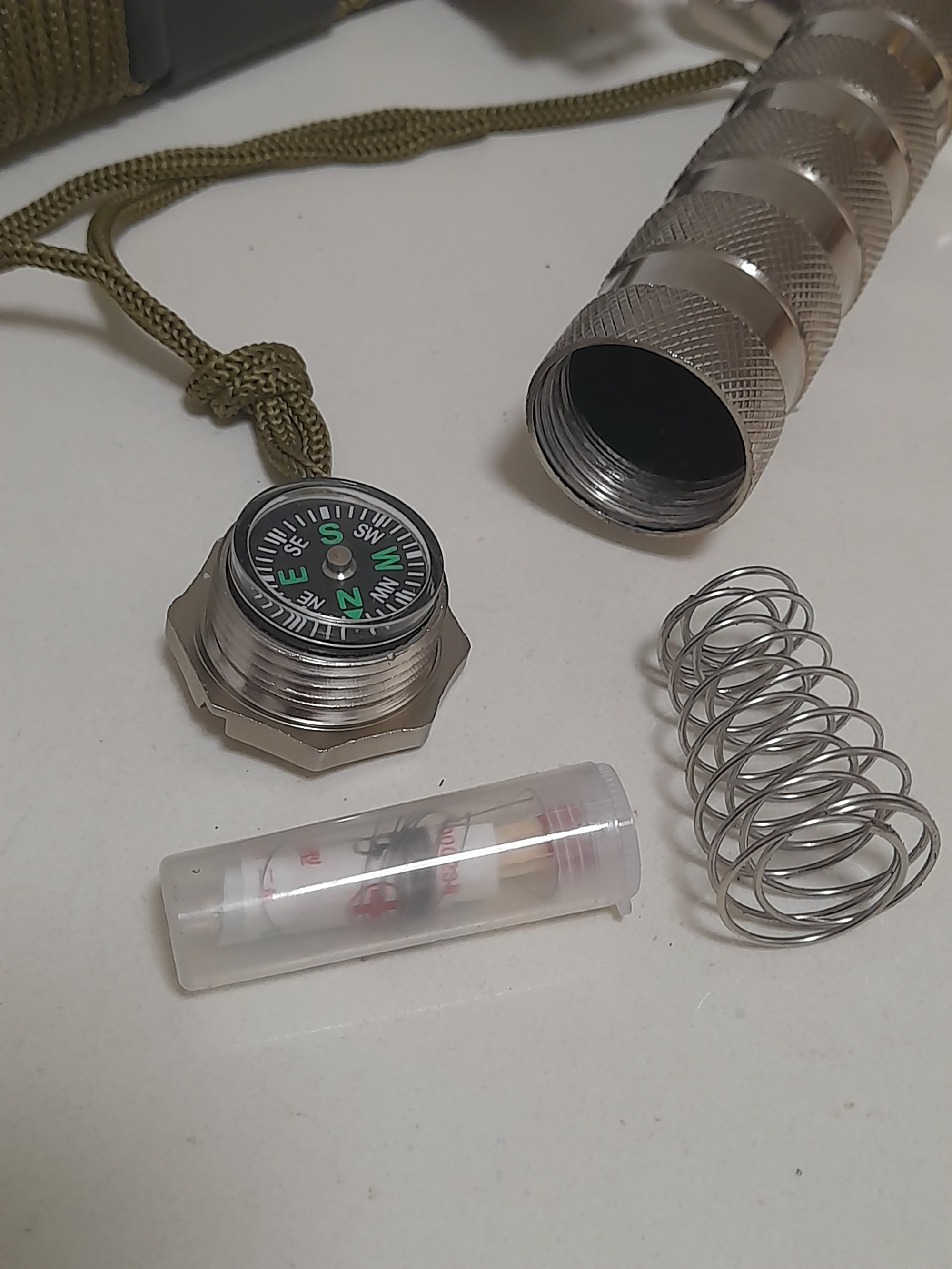 The handle has a waterproof storage with a sealed container with matches, thread and needle. The pommel of the handle has a compass. The plastic sheath contains a chamber with a spare skinner knife equipped with a bottle opener, gut hook, and a slot for unbolting nuts and bolts. Also the sheath has a pullout tray with a ruler, signalling mirror and a rubber tube for slingshot. Metal legs on the bottom of the sheath can be used as a Y-frame of the slingshot. The outer side of the sheath has a few metres of a green paracord.